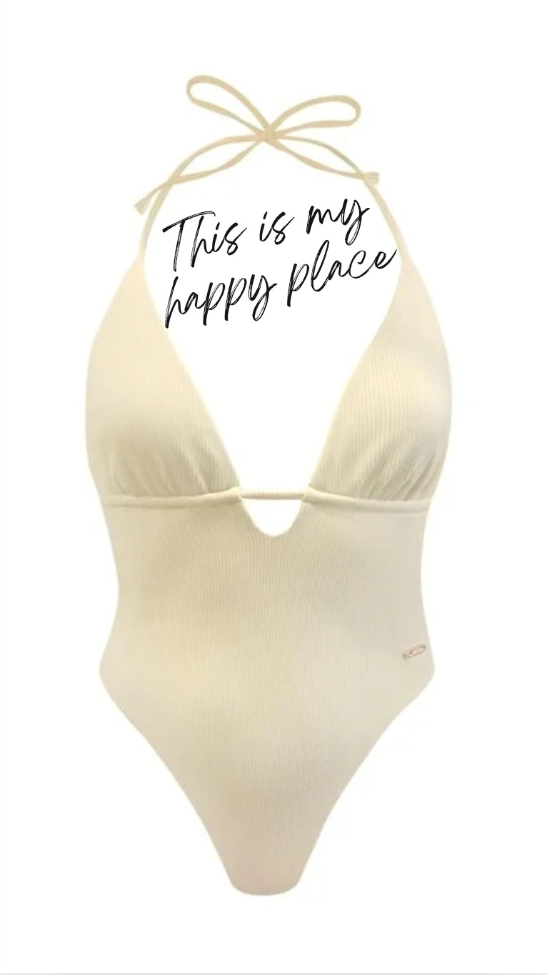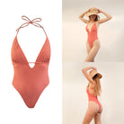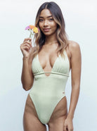 Channel effortless sophistication with the Coastal Muse one-piece, crafted in textured fabric that whispers luxury. This stunning swimsuit features a deep V halter neckline and high-cut leg design.